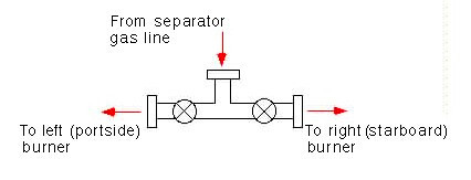 Gas from the separator flows through the gas manifold (connected to the separator gas line) and is directed to one of two gas flares, the gas manfild is equipped with 2 ball valves.