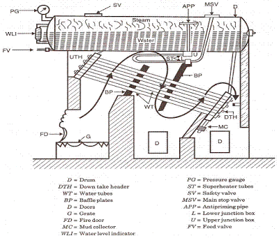 That portion of water tubes which is just above the furnace is heated comparatively at a higher temperature than the rest of it. Water, its density being decreased, rises into the drum through the uptake-header. Here the steam and water are separated in the drum. Steam being lighter is collected in the upper part of the drum. The water from the drum comes down through the down –comer into the water tubes.